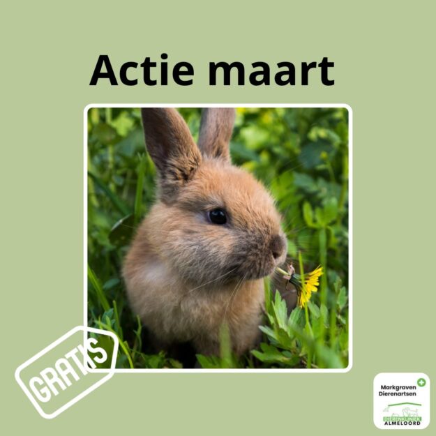 Actie maart Start deze maand het VetPlan voor uw konijn en krijg de eerste maand 𝗴𝗿𝗮𝘁𝗶𝘀! Wat houdt het VetPlan konijn eigenlijk in? Voor €8,95 per maand krijgt u: – De jaarlijkse vaccinatie en gezondheidscheck – 3x 1,5 kg konijnenvoer – Spray tegen maden en vliegen (Myiasis) Maar ook: – Onbeperkt gratis nagels knippen –…