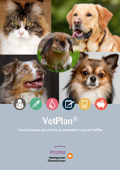 Bij Markgraven Dierenartsen begrijpen we hoe belangrijk het is om uw huisdier in topconditie te houden. Daarom bieden we ons VetPlan aan: een uitgebreide en betaalbare manier om de gezondheidszorg van uw huisdier te waarborgen. Ons VetPlan zorgt ervoor dat uw hond, kat of konijn de preventieve zorg krijgt die ze nodig hebben, tegen een vast maandbedrag en extra kortingen.